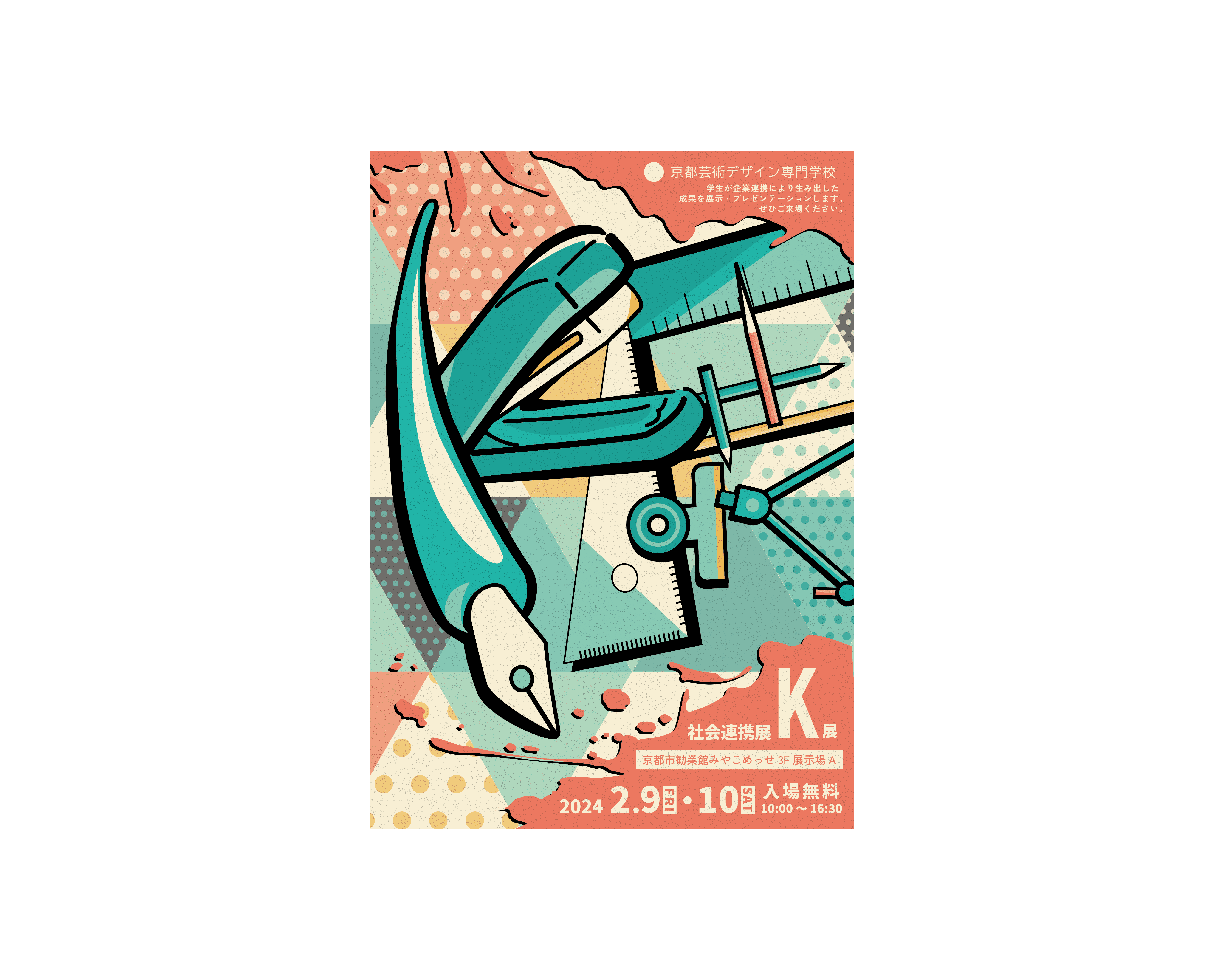 その学生のイメージを持ってもらうため、Gペンやホッチキス など文房具で『K展』を表しました。