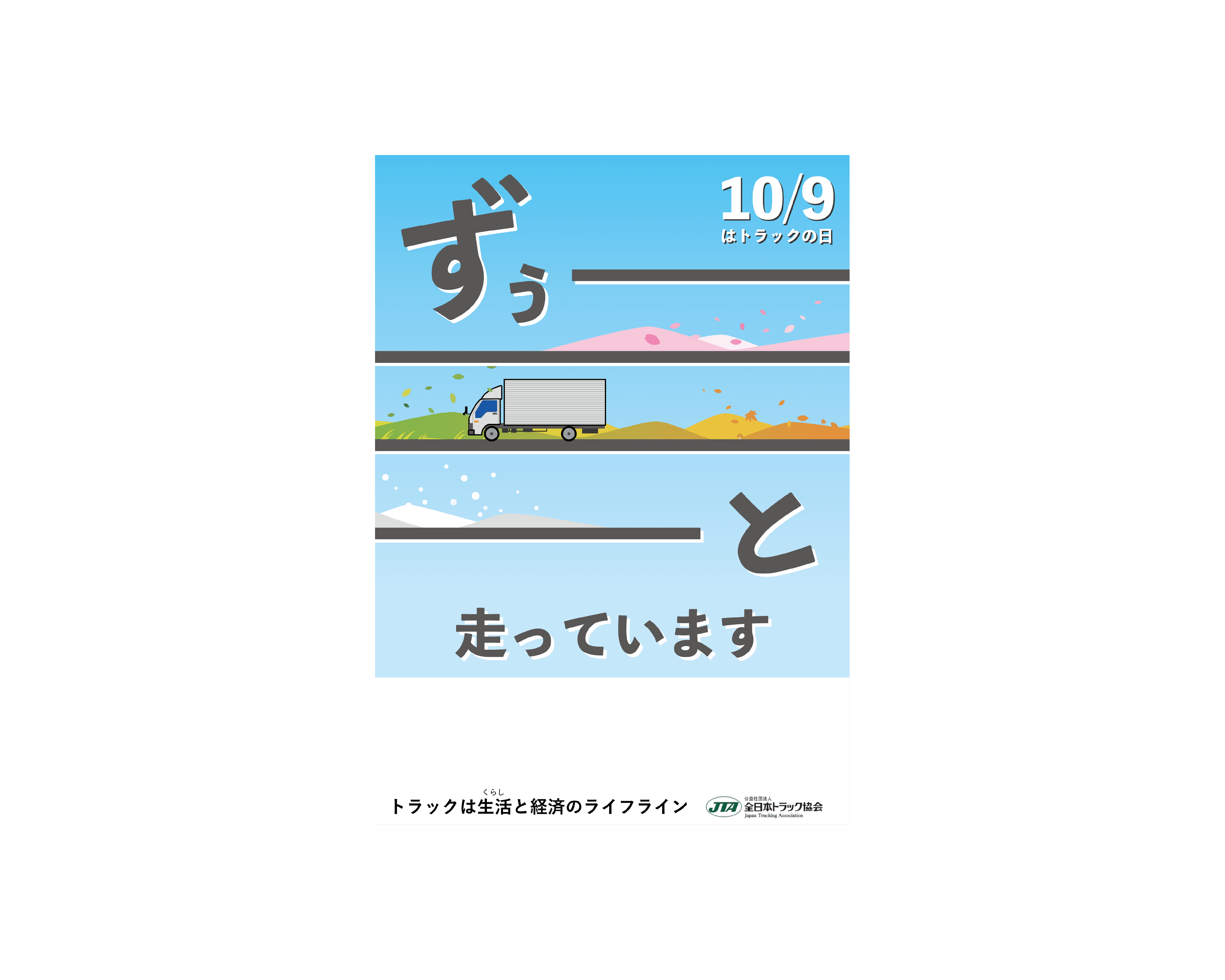 「トラックの日」ポスターデザインの公募に応募しました。 このポスターを見ることによって、トラック運転手の大変さを知ってもらい、荷物を受け取る時、感謝できるようになってもらいたいと思います。 デザインのポイントは、文字にあえて黒を使用しなかった所です。 グレーを使用することで画面を落ち着かせるように制作しました。